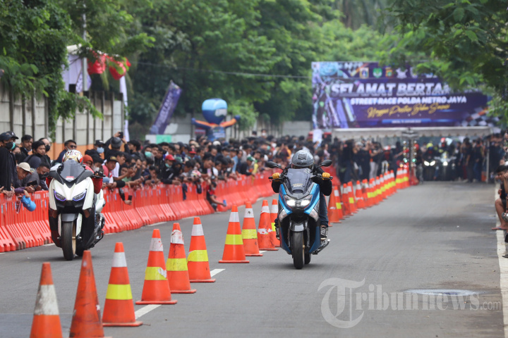 Peserta memacu sepeda motornya dalam ajang Street Race yang di gelar Polda Metro Jaya, Jakarta Selatan, Minggu (16/1/2022). Ajang lomba balap sepeda motor jalanan legal yang diprakarsai oleh Kapolda Metro Jaya Irjen Pol Fadil Imran tersebut untuk memfasilitasi para pembalap liar agar tidak melakukan balapan di jalan. Tribunnews/Jeprima