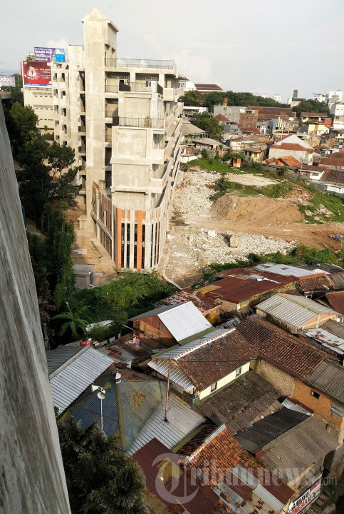 Proyek Rumah Deret Tamansari dilihat dari Flyover Pasupati, Kelurahan Tamansari, Kecamatan Bandung Wetan, Kota Bandung, Jawa Barat, Selasa (18/1/2022). Pemerintah Kota Bandung menyatakan pembangunan tahap kedua Rumah Deret Tamansari telah mencapai 100 persen dan ditargetkan pada 2022 ini sudah bisa dihuni secara bertahap dengan memprioritaskan warga terdampak, yakni warga RW 11 yang rumahnya ditertibkan di lahan tempat dibangunnya rumah deret. TRIBUN JABAR/GANI KURNIAWAN