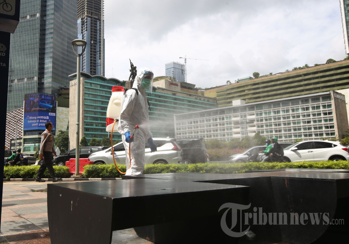 Petugas PMI DKI Jakarta melakukan penyemprotan disinfektan Fasilitas Umum di Kawasan Bundaran HI, Jakarta Pusat, Senin (7/2/2022). Kegiatan tersebut sebagai bentuk pencegahan penyebaran virus Omricon yang sedang tinggi-tingginya di Jakarta. WARTA KOTA/ANGGA BHAGYA NUGRAHA