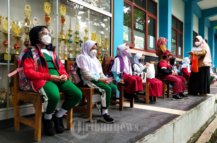 Sejumlah pelajar menunggu jemputan seusai mengikuti pembalajaran tatap muka (PTM) di SDN 016 DR Cipto, Jalan Pajajaran, Kota Bandung, Jawa Barat, Senin (7/2/2022). Dinas Pendidikan Kota Bandung memberlakukan pembatasan kapasitas pelajar mengikuti PTM di sekolah yakni hanya 50 persen mulai Senin, 7 Februari 2022. Kebijakan tentang pengetatan PTM itu diambil untuk mengantisipasi lonjakan kasus Covid-19 di Kota Bandung. (TRIBUN JABAR/GANI KURNIAWAN)