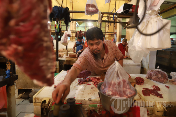 Pedagang menimbang daging di Pasar Kebayoran Lama, Jakarta Selatan, Rabu (23/2/2022). Harga daging sapi di Pasar Kebayoran Lama mengalami kenaikan sebesar Rp 10.000 dari harga sebelumnya Rp 120.000 menjadi Rp 130.000. Kondisi ini justru mempersulit para pedagang untuk berjualan pasalnya warga mulai enggan membeli daging dengan harga yang tinggi. Tribunnews/Jeprima