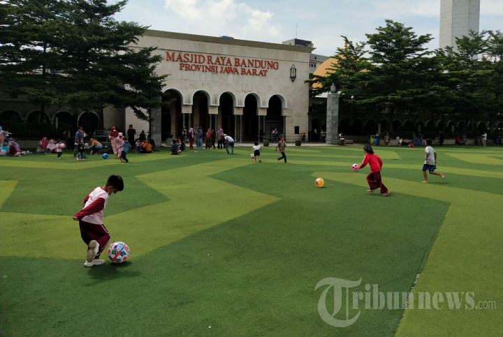 Pengunjung berwisata di lapangan rumput sintetis Alun-alun Kota Bandung, Jawa Barat, Jumat (11/3/2022). Kendati Kota Bandung masih masuk kategori Pemberlakuan Pembatasan Kegiatan Masyarakat (PPKM) level 3, namun kunjungan wisatawan ke Kota Bandung tetap ramai, terutama di akhir pekan. TRIBUN JABAR/GANI KURNIAWAN