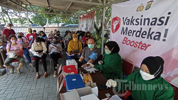 Ratusan warga antre untuk mengikuti vaksinasi Covid-19 dosis 1, 2 dan Booster dengan jenis vaksin Sinovac dan Astrazeneca di Halaman Mapolsek Neglasari, Kota Tangerang, Rabu (6/4/2022). Dalam pelaksanaan Vaksinasi Merdeka ini warga mendapatkan minyak goreng dan beras gratis. Pemberian sembako ini bertujuan untuk memotivasi warga mengikuti program vaksinasi ini. Selain itu, antusiasme warga mengikuti kegiatan ini juga untuk memenuhi keperluan persyaratan mudik lebaran. WARTA KOTA/NUR ICHSAN