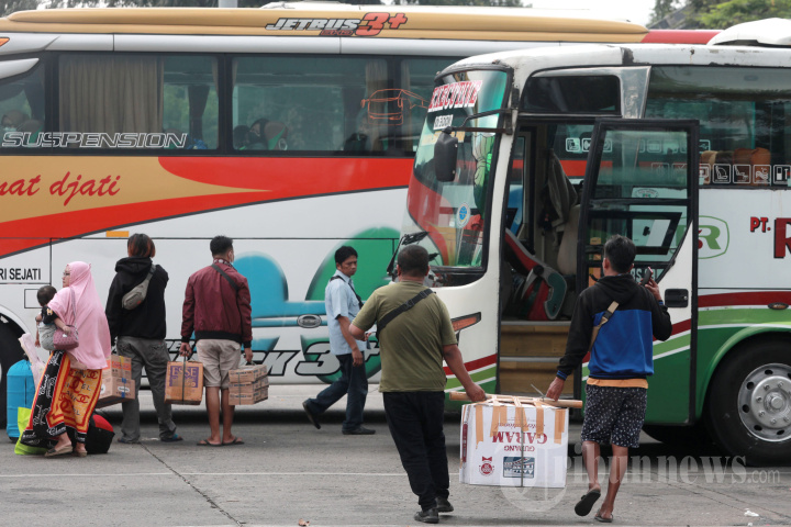 Pemudik menaiki bus yang mengangkut mereka ke kampung halaman di Terminal Kampung Rambutan, Jakarta, Senin (18/4/2022). Menteri Perhubungan Budi Karya Sumadi menyarankan masyarakat melakukan perjalanan mudik lebaran 2022 lebih awal guna menghindari risiko kemacetan lalu lintas. TRIBUNNEWS/IRWAN RISMAWAN