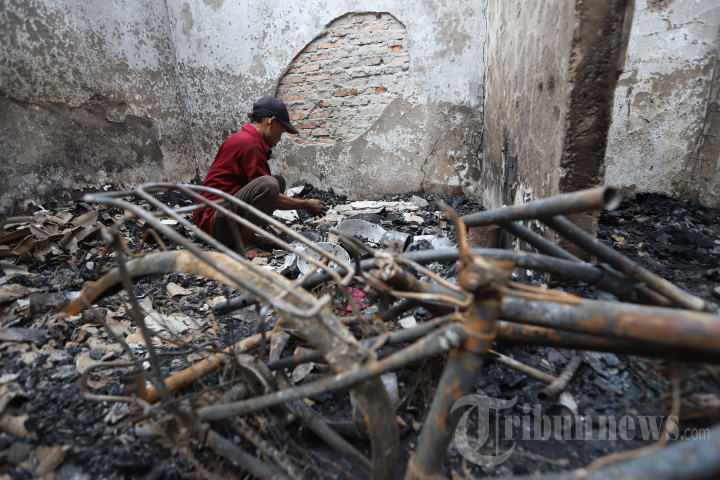 Warga mengais sisa-sisa puing kebakaran yang asih bisa terpakai di kawasan Pasar Gembrong, Jatinegara, Jakarta Timur, Senin (25/4/2022). Diketahui, kebakaran hebat melanda Pasar Gembrong, Jakarta Timur pada Minggu (24/4) malam. Kebakaran hebat itu menghanguskan 400 bangunan rumah dan pertokoan di 5 RT di RW 01 dengan kerugian yang ditaksir mencapai Rp 1,5 miliar dan jumlah korban jiwa yakni 450 KK atau sekitar 1.000 jiwa. Dugaan sementara, kebakaran Pasar Gembrong disebabkan dari korsleting listrik yang berasal dari rumah warga. Tribunnews/Jeprima