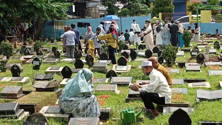 ZIARAH KUBUR - Pemakaman Wakaf Babakan Semboja, Kota Tangerang, di hari pertama lebaran ini dipadati para peziarah, Senin (2/5/2022). Membludaknya peziarah memberi rejeki nomplok bagi para pedagang yang berjualan makanan, minuman maupun jasa di sekitaran malam. WARTA KOTA/NUR ICHSAN