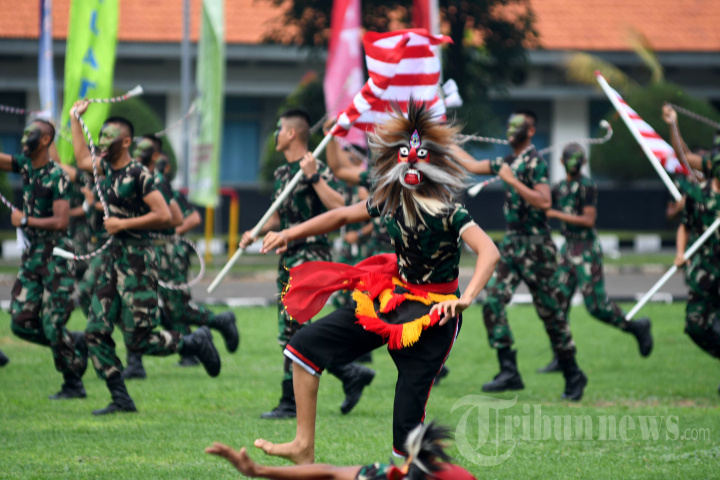 Penampilan tari Reog Ponorogo oleh siswa TNI AL usai upacara peringatan Hari Pendidikan TNI Angkatan Laut (Hardikal) ke-76 di Komando Pembinaan Doktrin, Pendidikan dan Latihan TNI AL (Kodiklatal), Bumimoro, Kota Surabaya, Jawa Timur, Jumat (13/5/2022). Peringatan Hardikal ke-76 bertema Lembaga Pendidikan TNI Angkatan Laut terus berkomitmen membangun sumber daya manusia unggul guna mewujudkan TNI Angkatan Laut yang profesional, modern, dan tangguh. SURYA/AHMAD ZAIMUL HAQ