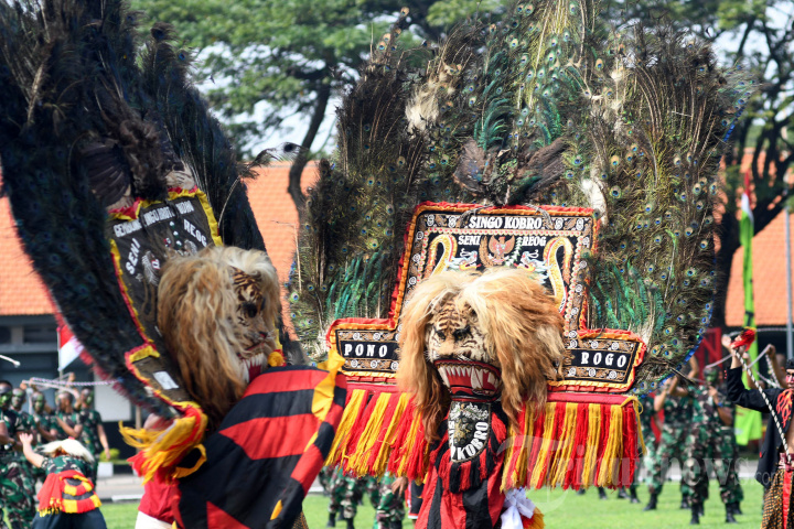 Penampilan tari Reog Ponorogo oleh siswa TNI AL usai upacara peringatan Hari Pendidikan TNI Angkatan Laut (Hardikal) ke-76 di Komando Pembinaan Doktrin, Pendidikan dan Latihan TNI AL (Kodiklatal), Bumimoro, Kota Surabaya, Jawa Timur, Jumat (13/5/2022). Peringatan Hardikal ke-76 bertema Lembaga Pendidikan TNI Angkatan Laut terus berkomitmen membangun sumber daya manusia unggul guna mewujudkan TNI Angkatan Laut yang profesional, modern, dan tangguh. SURYA/AHMAD ZAIMUL HAQ