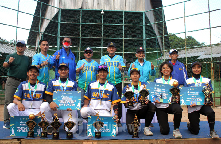 Sekretaris Daerah Pemerintah Provinsi Jawa Barat (Sekda Pemprov Jabar), Setiawan Wangsaatmaja berfoto bersama peraih best pitcher, best slugger, dan MVP kategori putra dan putri Kota Bandung dalam kejuaraan Softball U-20 Piala Bergilir Gubernur Jawa Barat 2022 di Lapangan Softball Lodaya, Kota Bandung, Jawa Barat, Minggu (19/6/2022). Dalam kejuaraan tersebut, tim putra dan putri Kota Bandung berhasil meraih juara pertama. Sementara posisi runner up kategori putra diraih Kota Cirebon, juara ketiga Kota Bogor, dan juara keempat Kabupaten Cirebon. Adapun, juara kedua pada kategori putri diraih Kabupaten Karawang, juara ketiga Kota Bogor, dan juara keempat Kota Cirebon. (TRIBUN JABAR/GANI KURNIAWAN)