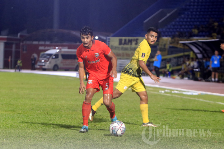 Pesepak bola Borneo FC Samarinda, Leo Guntara (kiri) melewati adangan pesepak bola Barito Putera, Ambrizal Umanailo dalam laga lanjutan Grup B Piala Presiden 2022 antara Borneo FC Samarinda melawan Barito Putera di Stadion Segiri, Kota Samarinda, Kalimantan Timur, Rabu (22/6/2022) sore. Pada pertandingan tersebut, Borneo FC harus puas ditahan imbang tanpa gol oleh Barito Putera yang bermain dengan 10 pemain sejak menit ke-57. TRIBUN KALTIM/NEVRIANTO HARDI PRASETYO