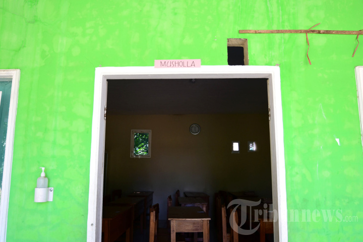 Musala di SDN Pandanlandung 3, Kecamatan Wagir, Kabupaten Malang, Jawa Timur, menjadi ruangan sementara karena kondisi gedung kelas yang rusak, Senin (1/8/2022). Sebanyak empat kelas di sekolah tersebut rusak karena usia bangunan yang sudah tua sehingga guru dan siswa mengikuti kegiatan pembelajaran dengan penuh kekhawatiran karena atap bangunan bisa roboh sewaktu-waktu. Gedung yang dibangun pada tahun 2006 lalu itu mulai mengalami kerusakan pada tahun 2017. TRIBUN JATIM/PURWANTO
