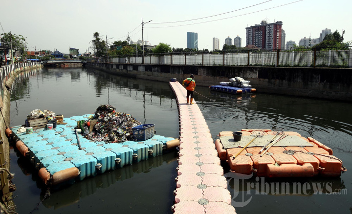 Petugas membersihkan sampah yang tersangkut di Kali Item, Kemayoran, Jakarta Pusat, Selasa (9/8/2022). Minimnya kesadaran warga akan buang sampah, membuat petugas setiap harinya harus memungut sampah yang di dominasi limbah rumah tangga. (Warta Kota/YULIANTO)