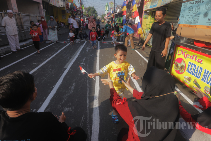Anak-anak antusias mengikuti perlombaan 17 Agustusan di Jalan Cipinang Muara 3 Jakarta Timur, Minggu (14/8/2022). Perlombaan dalam rangka memeriahkan HUT ke-77 RI kembali diselenggarakan di sejumlah tempat setelah dua tahun ditiadakan akibat pandemi Covid-19. TRIBUNNEWS/HERUDIN