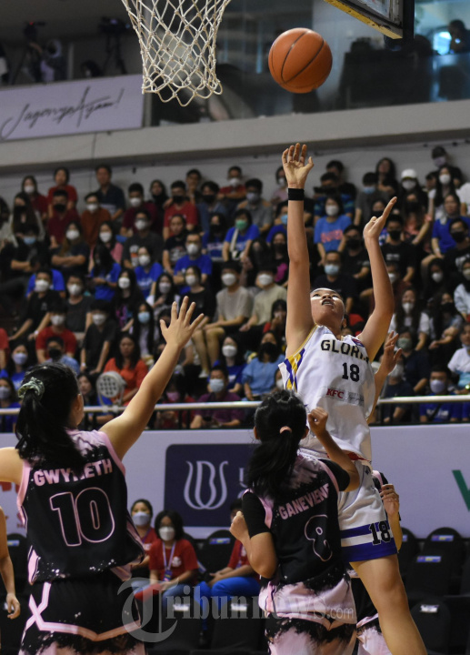 GLORIA 1 CHAMPION - Aksi para pemain pada Final Putra antara SMA ST Louis 1 Surabaya (jersey hitam) melawan SMA Gloria 1 Surabaya (jersey putih) pada "Honda DBL with KFC 2022 East Java Series Nort Region", di DBL Arena Surabaya, Selasa (20/9/2022). SURYA/HABIBUR ROHMAN