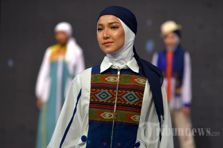 Model memeragakan busana karya desainer Aura Afilia bertema Saksvarna yang berarti Pesona Warna diambil dari Bahasa Sanskerta pada gelaran Surabaya Fashion Parade 2022 di Tunjungan Plaza, Kota Surabaya, Jawa Timur, Jumat (7/10/2022) malam. Sebanyak 14 koleksi ready to wear dominan warna putih dengan padu padan kain tenun ulos Medan yang memadukan warna hijau mint, putih, dan biru elektrik ditampilkan dalam gelaran tersebut. SURYA/AHMAD ZAIMUL HAQ