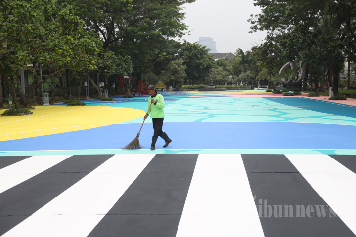 Petugas membersihkan lapangan yang dihiasi mural di Lapangan Taman Menteng, Jakarta Pusat, Selasa (18/10/2022). Pembuatan mural bertajuk Gelora Ragam hiasi empat lapangan Taman Menteng yang didukung oleh studio kreatif Mahavisual terinspirasi dari semangat keberagaman di Kota Jakarta. Mural di kawasan Taman Menteng dikerjakan selama dua minggu yaitu pada 1 hingga 14 Oktober 2022 dan tim kerja Stereoflow sebanyak 16 seniman.