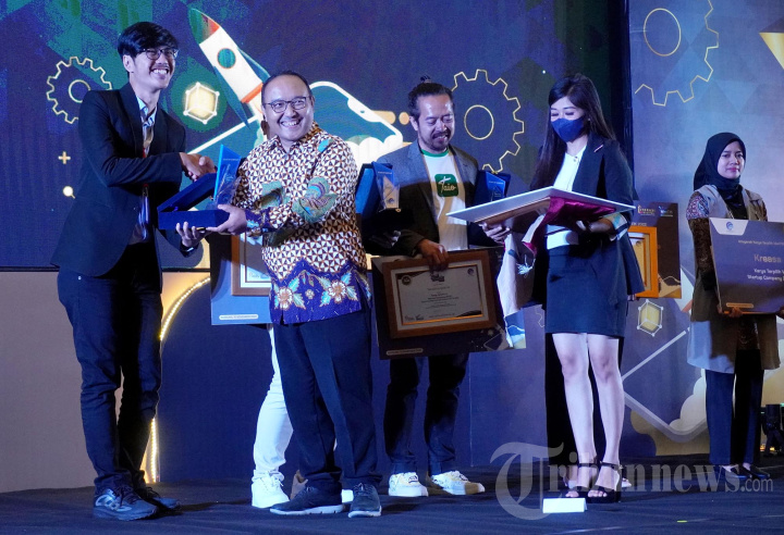 Direktur Pemberdayaan Informatika Kementerian Kominfo, Bonifasius Wahyu Pudjianto memberikan penghargaan kepada peraih karya terpilih kategori Startup Company kompetisi Indonesia Entrepreneur TIK (IdenTIK) dalam Penganugerahan IdenTIK 2022 di Kota Bandung, Jawa Barat, Kamis (10/11/2022). Hasil kurasi, terpilih 18 karya pemenang IdenTIK Tahun 2022 peraih peringkat tiga besar pada masing-masing kategori yang akan memperoleh pembinaan serta pelatihan untuk mempersiapkan menghadapi kompetisi regional ASEAN ICT Awards (AICTA) pada tahun 2023. IdenTIK adalah kompetisi tahunan yang diselenggarakan Kemenkominfo dalam rangka menggali potensi produk teknologi informasi dan komunikasi (TIK) karya anak bangsa agar mampu bersaing di tingkat dunia. Pada kesempatan yang sama, Kemenkominfo dan Kemendagri melaunching Massive Open Online Course (MOOC) Literasi Digital Sektor Pemerintahan yang merupakan pelatihan online yang tersedia bagi ASN, TNI dan Polri. (TRIBUN JABAR/GANI KURNIAWAN)