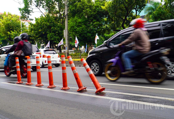 Sejumlah pengendara melintas di samping stick cone pembatas jalur sepeda di Kawasan Jalan Kramat Raya, Jakarta Pusat, Selasa (7/2/2023). Keadaan stick cone disejumlah ruas di Jakarta tampak rusak dan tidak terpasang dengan benar. (Warta Kota/Angga Bhagya Nugraha)
