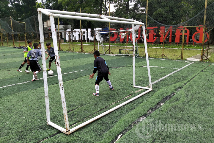 Sejumlah anak bermain bola di lapangan futsal yang sudah rusak di Taman Persib, Jalan Supratman, Kecamatan Bandung Wetan, Kota Bandung, Jawa Barat, Sabtu (11/3/2023). Lapangan futsal ini sudah bertahun-tahun kondisinya tidak terawat. Rumput sintetisnya banyak yang mengelupas dan pagar jaring kawatnya sudah banyak yang jebol. TRIBUN JABAR/GANI KURNIAWAN
