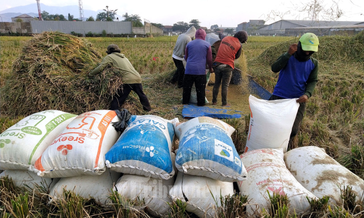 Buruh tani menjahit karung berisi gabah yang baru dirontokan melalui proses mekamis pada panen padi di kawasan Mengger, Kecamatan Dayeuhkolot, Kabupaten Bandung, Jawa Barat, Kamis (16/3/2023). Pemerintah melalui Badan Pangan Nasional (Bapanas) secara resmi menaikkan Harga Pembelian Pemerintah (HPP) untuk Gabah Kering Panen (GKP) di tingkat petani menjadi Rp 5.000 per kilogram dari HPP semula Rp 4.200 per kilogram. Sementara, untuk GKP di tingkat penggilingan Rp 5.100, Gabah Kering Giling (GKG) di penggilingan Rp 6.200, dan GKG di gudang Perum Bulog Rp 6.300. (TRIBUN JABAR/GANI KURNIAWAN)