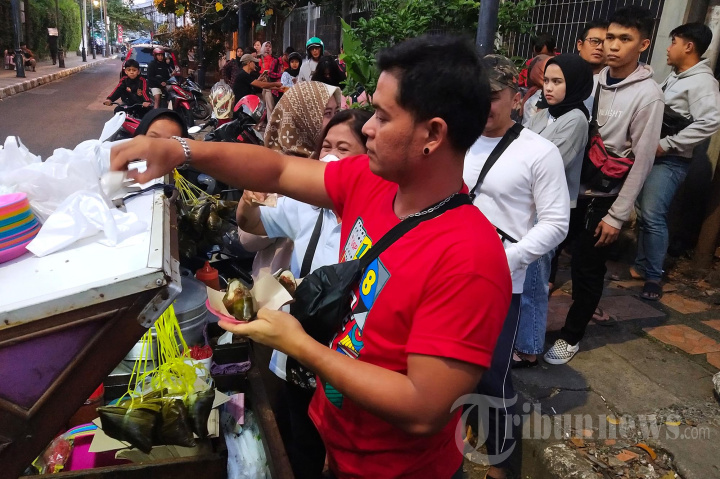 Warga antre membeli Bacang Panas Braga yang dijual di gerobak, di Jalan Homan, samping Hotel Savoy Homann, Kota Bandung, Jawa Barat, Rabu (19/7/2023). Bacang Panas Braga milik Abdul Halim (51) sudah ada sejak 1991, awalnya dijual keliling di kawasan Alun-Alun Kota Bandung, kemudian memilih mangkal di Jalan Braga dan sekarang sudah sekitar sebulan pindah di Jalan Homan. Kuliner yang terbuat dari beras ini dijual Rp 10.000 per buah, disajikan dalam kondisi panas dengan toping tetelan jando dan sambal merah pedas. Setiap hari dijajakan mulai pukul 17.00 hingga larut malam, rata-rata habis terjual sebanyak 600 bacang. (TRIBUN JABAR/GANI KURNIAWAN)