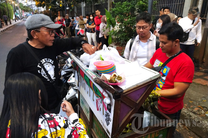 Warga antre membeli Bacang Panas Braga yang dijual di gerobak, di Jalan Homan, samping Hotel Savoy Homann, Kota Bandung, Jawa Barat, Rabu (19/7/2023). Bacang Panas Braga milik Abdul Halim (51) sudah ada sejak 1991, awalnya dijual keliling di kawasan Alun-Alun Kota Bandung, kemudian memilih mangkal di Jalan Braga dan sekarang sudah sekitar sebulan pindah di Jalan Homan. Kuliner yang terbuat dari beras ini dijual Rp 10.000 per buah, disajikan dalam kondisi panas dengan toping tetelan jando dan sambal merah pedas. Setiap hari dijajakan mulai pukul 17.00 hingga larut malam, rata-rata habis terjual sebanyak 600 bacang. (TRIBUN JABAR/GANI KURNIAWAN)