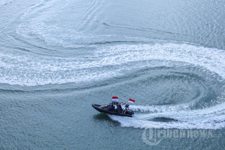 Personil polisi membentuk buih gelombang dengan angka 78 di Perairan Jembatan Fisabilillah Kota Batam, Provinsi Kepulauan Riau, Rabu (16/8). Kirab kebangsaan yang diikuti personil dari TNI dan Polisi ini dalam rangka perayaan HUT ke-78 Kemerdekaan Republik Indonesia. (TRIBUN BATAM/ARGIANTO DA NUGROHO)