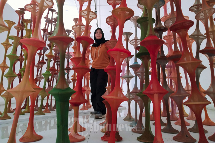 Pengunjung mengamati karya seni instalasi yang terdiri dari komponen-komponen modular yang disusun dari material stocking nilon secara berlapis berjudul 'Massa Manusa' karya Michelle Jovita dalam pameran bertajuk Equivocal di Galeri Pusat Kebudayaan, Jalan Naripan, Kota Bandung, Jawa Barat, Kamis (19/10/2023). Berbekal pengalaman seniman yang pernah dan sedang menjajaki status akademisi, pameran ini menyajikan berbagai bentuk karya trimatra maupun dwimatra, taat konversi maupun yang berdalih dari konversi. Keseluruhannya berangkat dari premis praktik kekaryaan yang terbangun pasca mengalami 'benturan' dan 'penataan' dari sebuah sistem dalam institusi pendidikan seni rupa. Pameran yang menampilkan keragaman karya 16 seniman dari ITB, UPI, dan ISBI Bandung tersebut akan berlangsung hingga 30 Oktober 2023. (TRIBUN JABAR/GANI KURNIAWAN)