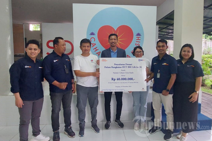 Plt. Direktur Utama BRI Life I Dewa Gede Agung (tengah) secara simbolis menyerahkan donasi kepada pengurus Panti Asuhan Yayasan Cahaya Cinta Kasih, Jl. Gunung Sanghyang No.118 D, Padangsambian, Kec. Denpasar Barat, Bali. BRI Life menutup rangkaian semarak kegiatan Hari Ulang Tahun ke-36, dengan menyalurkan donasi ke sejumlah panti asuhan yang tersebar di Pulau Jawa dan Bali. Selain sebagai implementasi rasa syukur, kegiatan yang dilaksanakan di sepanjang bulan November dan Desember 2023 tersebut juga sebagai salah satu upaya dalam meningkatkan semangat kepedulian terhadap sesama. TRIBUNNEWS/HO