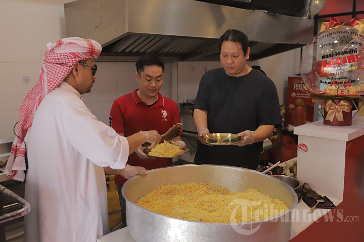 Chef Fiaz Hussain menuangkan makanan khas Timur Tengah kepada Owner Nasi Mandhi Lagih David Sutedja dan Billie Soetaman saat Grand Opening restoran cepat saji Nasi Mandhi Lagih di kawasan Mangga Besar, Jakarta Barat beberapa waktu lalu. Restoran ini menghadirkan konsep fast food dan menjawab kerinduan warga Jakarta akan citarasa Timur Tengah dengan waktu penyajian yang cepat, harga terjangkau dan halal. Tribunnews/Jeprima