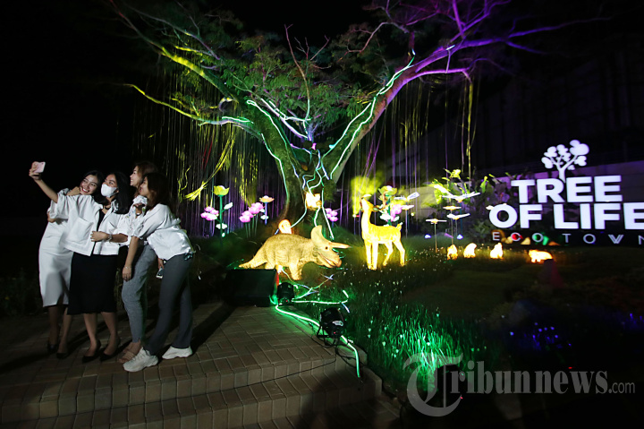 Sejumlah warga berfoto dengan latar belakang tata cahaya lampu usai peresmian di kawasan komersial Eco Town, Sawangan, Depok Jawa Barat, Selasa (19/3/2024). Vasanta Group melalui proyeknya Eco Town meresmikan tata pencahayaan yang berada di wilayah Senopati Boulevard, Depok sehingga mampu menjadi tujuan wisata dan tempat tinggal yang nyaman. Tribunnews/Jeprima