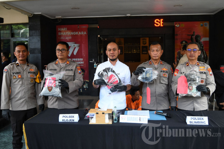 Kasat Reskrim Polresta Malang Kota, Kompol Danang Yudanto (tengah) didampingi para Kapolsek Polresta Malang Kota menunjukan barang bukti saat saat ungkap kasus pencurian kendaraan bermotor (Curanmor) dengan 19 laporan polisi di Polresta Malang Kota, Jawa Timur, Kamis (2/5/2024). Polresta Malang Kota berhasil menangkap empat palaku yakni, A (33), PA (35), TW (30) dan AR (30). Para pelaku melakukan pencurian kendaraan bermotor disejumlah TKP di Kota Malang dengan total barang bukti 4 sepeda motor dan dikenakan pas 363 KHUP dengan pidana penjara paling lama 9 tahun. SURYA/PURWANTO
