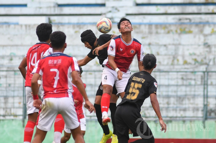 Pesepakbola NZR Sumbersari FC Malang, Risdianto Prasetyo (kiri) berduel bola udara dengan pesepakbola Persedikab Kediri, Raymond Fernando Toga Torop (kanan) saat laga lanjutan babak 32 besar Liga 3 nasional di stadion Gajayana Malang, Jawa Timur, Kamis (16/5/2024). NZR Sumbersari FC berhasil lolos ke babak 16 besar Liga 3 2023/2024 setelah ditahan imbang 1-1 oleh Persedikab Kediri. SURYA/PURWANTO