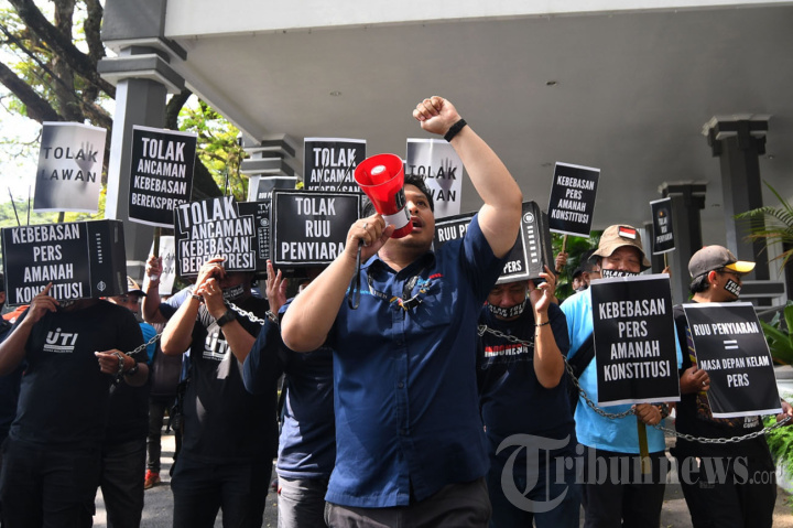 Sejumlah jurnalis yang tergabung dalam Jurnalis Malang Raya (Kabupaten Malang, Kota Malang, Kota Batu) yakni dari Persatuan Wartawan Indonesia (PWI), Ikatan Jurnalis Televisi Indonesia (IJTI), Pewarta Foto Indonesia (PFI), Aliansi Jurnalis Independen (AJI) melakukan aksi menolak draft rancangan undang-undang (RUU) penyiaran di gedung DPRD Kota Malang, Jawa Timur, Jumat (17/5/2024). Aksi tersebut menolak keras draft rancangan undang-undang (RUU) penyiaran yang kini sedang di bahas oleh badan legislatif (Baleg) DPR RI, karena terdapat sejumlah pasal yang dinilai akan membungkam kerja jurnalisme, salah satunya mengenai pelarangan penyiaran jurnalisme investigasi. SURYA/PURWANTO