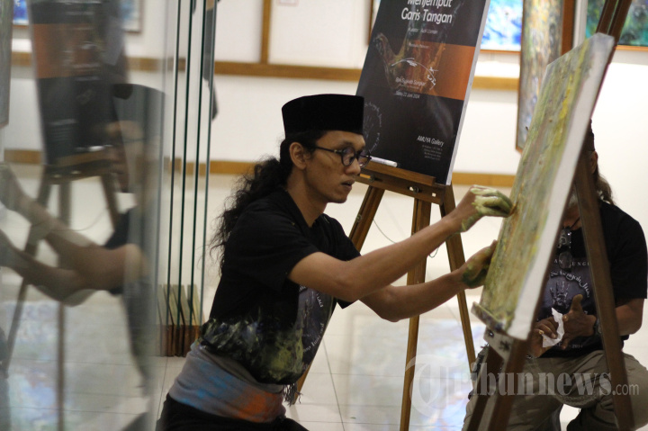 Pelukis Afit Ruseno tengah melakukan demo disela Pameran Tunggal di AMUYA Gallery, Jalan Angkasa 1, Kemayoran, Jakarta Pusat, Sabtu (22/06/2024). Pameran tunggal bertema Menjemput Garis Tangan ini, memamerkan sebanyak 27 karya lukisan dan akan berlangsung hingga 22 Juli 2024 mendatang. (WARTA KOTA/ANGGA BHAGYYA NUGRAHA)