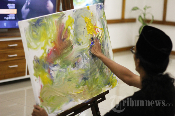 Pelukis Afit Ruseno tengah melakukan demo disela Pameran Tunggal di AMUYA Gallery, Jalan Angkasa 1, Kemayoran, Jakarta Pusat, Sabtu (22/06/2024). Pameran tunggal bertema Menjemput Garis Tangan ini, memamerkan sebanyak 27 karya lukisan dan akan berlangsung hingga 22 Juli 2024 mendatang. (WARTA KOTA/ANGGA BHAGYYA NUGRAHA)