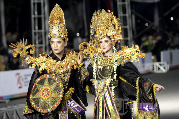 Peserta yang mengikuti rangkaian Jember Fashion Carnaval (JFC) di Jember, Jawa Timur, Sabtu (3/8/2024). Pupuk Indonesia Grup ambil bagian dalam Jember Fashion Carnaval (JFC) dan memamerkan 22 Artwear yang mengkombinasikan kain wastra UMKM binaan dengan bekas karung pupuk. Seluruh artwear dirancang perancang busana terkemuka Temma Prasetoo dan Maya Ratih. Ketua Perkumpulan Istri Karyawan Pupuk Indonesia (PIKA-PI) Tata Rahmad Pribadi menyampaikan bahwa kegiatan ini bertujuan untuk mendorong UMKM binaannya agar naik kelas dan go internasional.?Tribunnews/HO