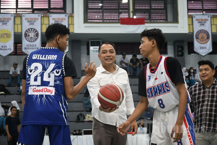 BASKET WALIKOTA - Walikota Surabaya Eri Cahyadi melempar bola pada prosesi pembukaan kejuaraan basket piala Walikota di GOR Pancasila Surabaya, Senin (9/9/2024) Pada basket Piala Walikota Heroes City League East Java 2024 ini diikuti 36 tim putra dan 19 tim putri dari siswa SMA se Kota Surabaya. (SURYA/HABIBUR ROHMAN)