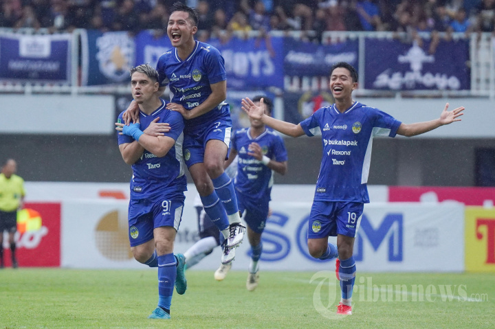 SELEBRASI - Pesepak bola PSIM Yogyakarta, Rafael Rodrigues (Rafinha, kiri) selebrasi bersama rekannya, Ghulam Fatkur (tengah) dan Figo Dennis setelah gol pertama saat melawan PSPS Riau dalam pertandingan Liga 2 2024/2025 babak 8 besar di Stadion Mandala Krida, Yogyakarta, Senin (17/2/2025) sore. PSIM berhasil mengalahkan PSPS 2-1 sekaligus memastikan tiket promosi Liga 1 2025/2026. Tribun Solo/Muhammad Nursina