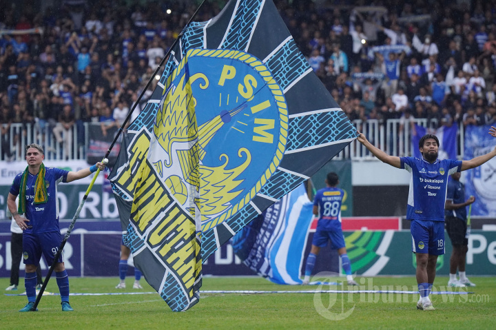 SELEBRASI - Pesepak bola PSIM Yogyakarta, Rafael Rodrigues (kiri) memegang bendera tim, bersama rekannya, Saldi setelah pertandingan melawan PSPS Riau Liga 2 2024/2025 babak 8 besar di Stadion Mandala Krida, Yogyakarta, Senin (17/2/2025) sore. PSIM berhasil mengalahkan PSPS 2-1 sekaligus memastikan tiket promosi Liga 1 2025/2026. Tribun Solo/Muhammad Nursina
