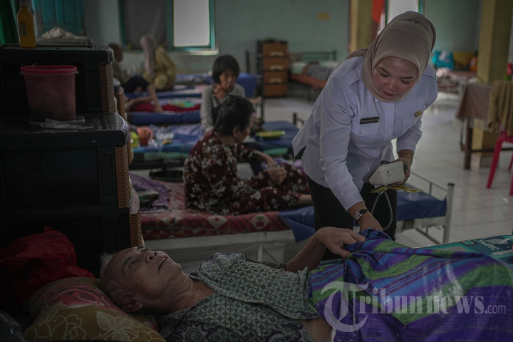 BPJS KESEHATAN - Mar'atun Ni'mah, Seorang perawat dari Dinas Sosial Provinsi Sumatera Selatan melakukan pemeriksaan kesehatan rutin kepada penghuni panti jompo di Panti Sosial Lanjut Usia, Jalan Sosial, Palembang, Rabu (23/7/2025).BPJS Kesehatan menanggung berbagai jenis pelayanan kesehatan, mulai dari pelayanan dasar hingga rujukan, termasuk pelayanan untuk penyakit kronis yang seringkali dialami oleh lansia. Sebagai komitmen pelayanan kesehatan di hari tua, yang diatur dalam Undang-Undang Nomor 40 Tahun 2004 tentang Sistem Jaminan Sosial Nasional (SJSN).TRIBUN SUMSEL/ABRIANSYAH LIBERTO