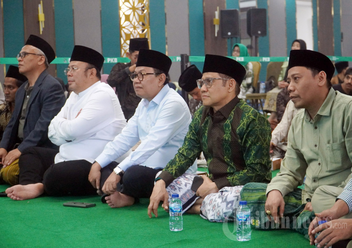 PENUTUPAN MUSABAQAH - Ketua Umum Partai Kebangkitan Bangsa (PKB) Muhaimin Iskandar (ketiga kanan) bersama pengurus PKB menghadiri acara penutupan Musabaqah Qira???atil Kutub Nasional di Kantor DPP PKB, Senen, Jakarta Pusat, Minggu (9/11/2025). Perlombaan membaca kitab yang diikuti puluhan santri dari berbagai pesantren di Indonesia tersebut mengkaji tema khusus seputar fikih siyasah atau politik Islam sebagai upaya memperkuat pemahaman politik kebangsaan di kalangan santri. Warta Kota/Yulianto
