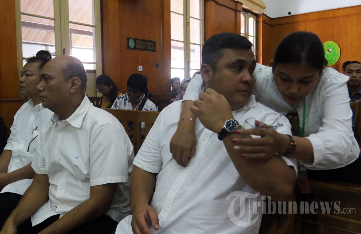 Terdakwa kerabatnya Kadis PUPR Pemprov Sumut Topan Obaja Ginting (dua kanan) menangis sambil memeluk anaknya sebelum menjalani sidang di Pengadilan Tipikor pada Pengadilan Negeri Medan, Rabu (19/11/2025). Agenda sidang JPU KPK membacakan dakwaan terhadap mantan Kadis PU Pemprov Sumut Topan Obaja Putra Ginting bersama Kepala UPTD Gunung Tua Dinas PUPR Sumut Rasuli Efendi Siregar tersandung kasus korupsi proyek jalan di Sumatra Utara. TRIBUN MEDAN/DANIL SIREGAR