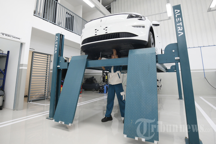 Mekanik mengecek kendaraan Aletra saat pembukaan showroom terbaru Aletra di kawasan Dewi Sartika, Cawang, Jakarta Timur, Kamis (20/11/2025). Pembukaan fasilitas baru ini menjadi bagian dari strategi perusahaan memperkuat jangkauan di pasar otomotif Indonesia, setelah sebelumnya hadir di Pluit, Pantai Indah Kapuk, Puri, Kemang, dan Riau. Mengusung layanan 3S (Sales, Service, Spare Parts) dengan konsep modern yang disiapkan untuk memberikan kenyamanan sesuai standar perusahaan. Fasilitas dealer ini mencakup area display kendaraan, customer lounge untuk konsultasi, serta ruang servis berkala yang terdiri dari dua stall dan satu area cuci mobil. Tribunnews/Jeprima