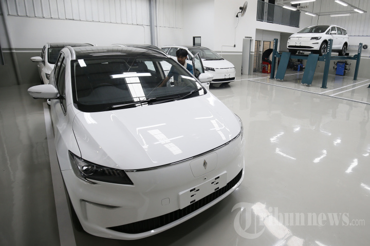 Mekanik mengecek kendaraan Aletra saat pembukaan showroom terbaru Aletra di kawasan Dewi Sartika, Cawang, Jakarta Timur, Kamis (20/11/2025). Pembukaan fasilitas baru ini menjadi bagian dari strategi perusahaan memperkuat jangkauan di pasar otomotif Indonesia, setelah sebelumnya hadir di Pluit, Pantai Indah Kapuk, Puri, Kemang, dan Riau. Mengusung layanan 3S (Sales, Service, Spare Parts) dengan konsep modern yang disiapkan untuk memberikan kenyamanan sesuai standar perusahaan. Fasilitas dealer ini mencakup area display kendaraan, customer lounge untuk konsultasi, serta ruang servis berkala yang terdiri dari dua stall dan satu area cuci mobil. Tribunnews/Jeprima