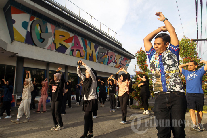 SENAM BERSAMA - Para karyawan Kompas Gramedia (KG) Group mengikuti Senam Aerobik penutupan KG CUP 2025, di Gramedia Gajah Mada, Medan, Sabtu (22/11/2025). Kegiatan KG CUP 2025 tersebut mengusung tema 'Energi Baru Semangat Juara' yang bertujuan untuk menyalakan energi positif, menumbuhkan semangat juang dan mendorong gaya hidup sehat di antara seluruh karyawan melalui ajang olahraga. TRIBUN MEDAN/DANIL SIREGAR