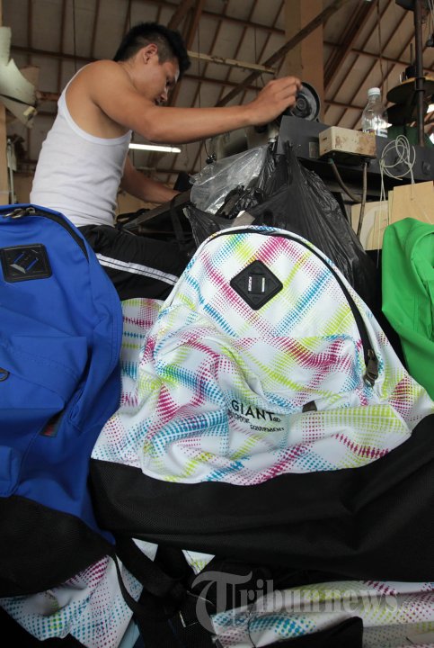 Seorang pekerja melakukan finishing membuat tas di rumah produksi Giant di Jalan Cidurian Utara, Kota Bandung, Senin (21/10/2013). Meski sejumlah bahan baku, seperti kain goretex, kain parasit, resleting, karet, benang, dan lain-lain naik di atas 10 persen dalam beberapa bulan terakhir, seluruh produk di tempat ini, seperti tas, topi, jaket, dan lain sebagainya belum mengalami kenaikan harga. Diperkirakan kenaikan harga pada 2014 mendatang, seiring terus naiknya harga sejumlah bahan baku impor. TRIBUN JABAR/GANI KURNIAWAN