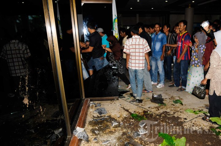 Sejumlah demonstran memecahkan kaca pintu dan merusak pot tanaman saat ratusan warga melakukan aksi unjuk rasa di Kantor Gubernur Aceh, Banda Aceh, Jumat (27/12/2013). Aksi menuntut janji uang Rp 500 ribu dari Pemerintah Aceh tersebut berlangsung ricuh sehingga polisi terpaksa membubarkan massa dengan melakukan tembakan ke udara. SERAMBI INDONESIA/M ANSHAR
