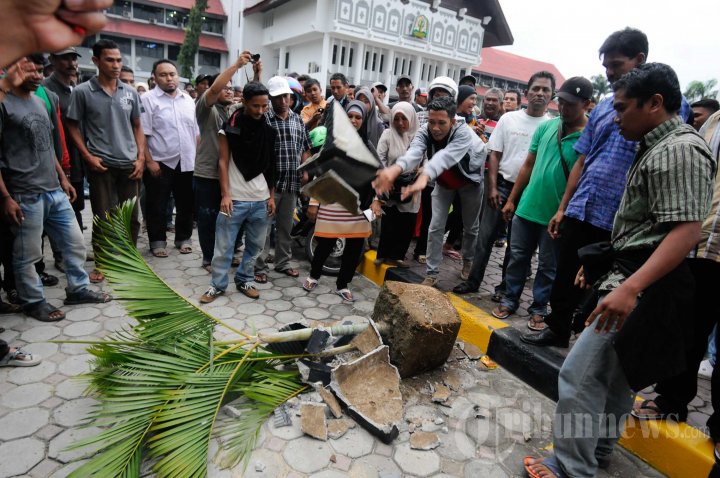 Sejumlah demonstran merusak pot-pot tanaman saat ratusan warga melakukan aksi unjuk rasa di depan Kantor Gubernur Aceh, Banda Aceh, Jumat (27/12/2013). Aksi menuntut janji uang Rp 500 ribu dari Pemerintah Aceh tersebut berlangsung ricuh sehingga polisi terpaksa membubarkan massa dengan melakukan tembakan ke udara. SERAMBI INDONESIA/M ANSHAR