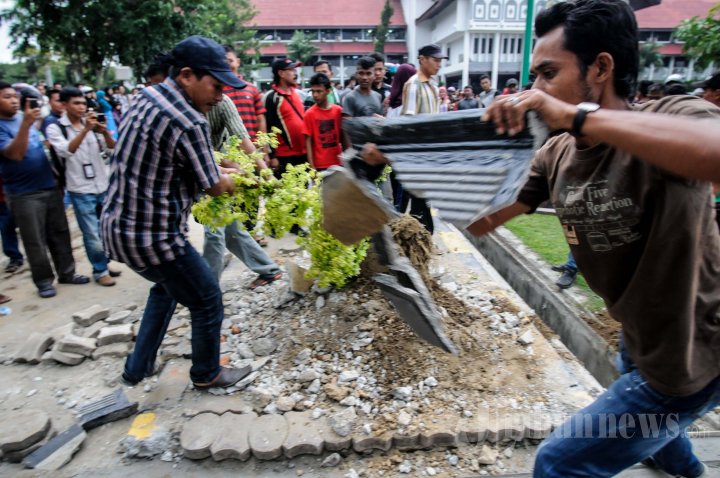 Sejumlah demonstran merusak pot-pot tanaman saat ratusan warga melakukan aksi unjuk rasa di depan Kantor Gubernur Aceh, Banda Aceh, Jumat (27/12/2013). Aksi menuntut janji uang Rp 500 ribu dari Pemerintah Aceh tersebut berlangsung ricuh sehingga polisi terpaksa membubarkan massa dengan melakukan tembakan ke udara. SERAMBI INDONESIA/M ANSHAR